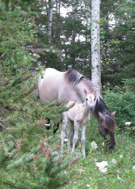 Even on the evening of the 6th of this month, there was no significant change in the way the foal was being carried, nor in Zorita's udder. But come dawn on Sunday morning the 7th, there was a delightful light form standing with Zorita apart from the rest of the family band who had come up for their breakfast oats. I didn't have my camera on me at the time, but I brought a pan of oats out to where Zorita was waiting and was able to get a closer look at her new foal. I was delighted to see that this time she had delivered a colt!